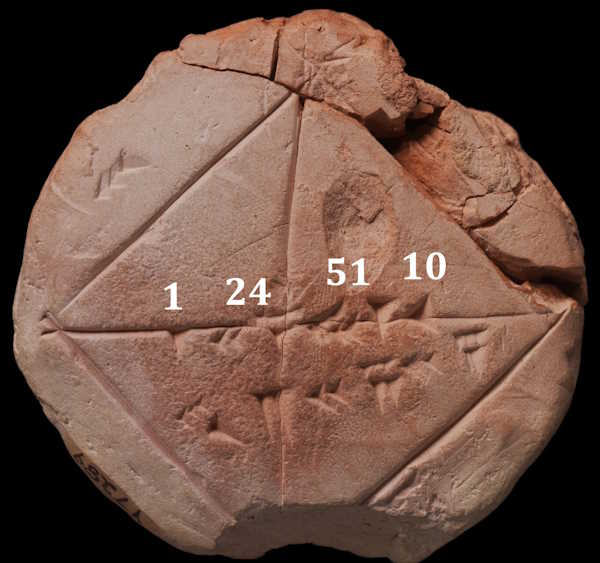 Arkeologlar, bu tabletin bir karenin köşegeninin hesabını gösterdiğini ortaya çıkardı. Bir kenarı 1 olan karenin köşegeni √2’ye eşittir. Tabletteki işaretlenmiş sayılar, √2’yi yaklaşık olarak hesaplamak için kullanılan katsayılara karşılık gelir.