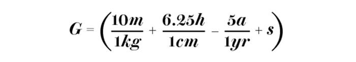Bu formüllerden birini aşağıda görüyorsunuz. Formülde, vücut ağırlığı (m, kilogram cinsinden), boy (h, santimetre cinsinden) ve yaş (a, yıl cinsinden) değerlerini girip, cinsiyete göre bir sabit (s) belirlediğinizde (erkekler için +5, kadınlar için –161), Mifflin–St. Jeor formülüyle bazal metabolizma hızını hesaplayabilirsiniz.