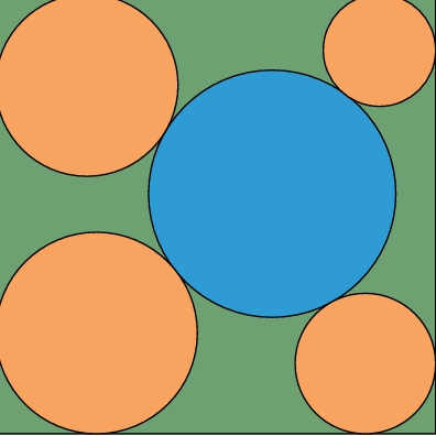 Bu problem, Gunma Eyaleti’nde bulunan 1874 tarihli bir sangaku levhasından alınmıştır. Büyük bir mavi daire, bir karenin içine yerleştirilmiştir. Karenin kenarlarına ve mavi daireye değen, farklı yarıçaplara sahip dört küçük turuncu daire vardır. Soru şudur: Bu dört küçük dairenin yarıçapları ile karenin bir kenarının uzunluğu arasında nasıl bir ilişki vardır?