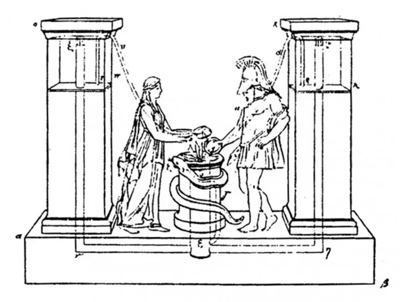 Heron’un anlatımına göre: “İçerideki hava, ısının etkisiyle seyrelerek hazneye doğru iner ve içindeki sıvıya baskı uygular. Sıvının başka kaçış yolu olmadığından, figürlerin içindeki borulardan geçerek akar ve ateş sönene kadar figürler sürekli olarak sunu döker.”