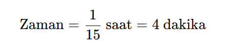 Bu süreyi dakikaya çevirirsek 4 dakika elde ederiz. Şimdi arabanın yokuş yukarı çıkışta ne kadar zaman harcadığını hesaplayalım. Araba, 1 kilometrelik tepeyi 15 km/sa hızla çıkıyor. Aynı formülü uygulayalım: