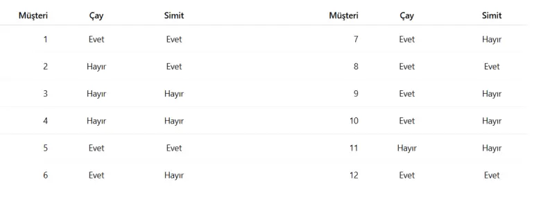 Bu bilgilerle şu soruya yanıt verebiliriz: Simit alan müşterilerin ne kadarı çay da sipariş etmektedir? Kurala göre aşağıdaki eşitliği sağlayan değer 4/5 olmalıdır. Yani simit alan müşterilerin beşte dördü aynı zamanda çay da sipariş etmektedir.