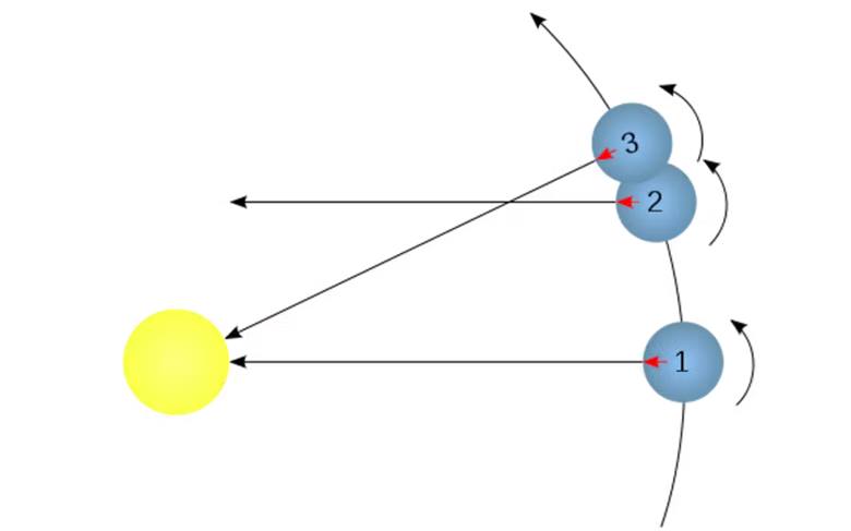 Konum 3: Ancak bu sırada Dünya, Güneş etrafındaki yörüngesinde de ilerlemiştir. Bu yüzden, Güneş’e yeniden dönük hâle gelmek için biraz daha dönmesi gerekir.