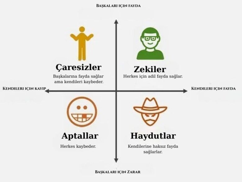 - Sol alt bölme ise “aptalların” alanıdır. Bu durum, konağını öldüren parazitlere benzetilebilir. Böyle davranışlar kısa vadede kazanç sağlasa da uzun vadede felaketle sonuçlanır.