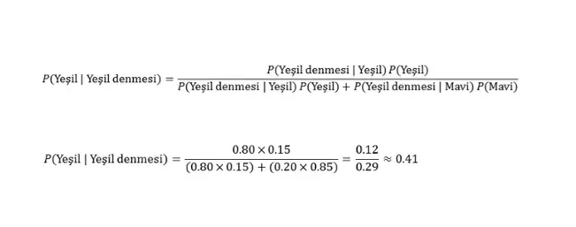Bayes teoremi uygulandığında, taksinin gerçekten yeşil olma olasılığı yeniden hesaplanır. Sonuçta elde edilen, yani güncellenmiş olasılık yüzde 41’dir.