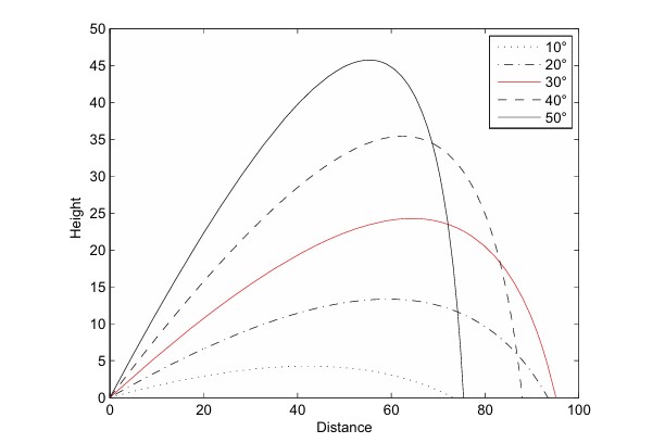 Golf topunun hareketini, atış açısı (𝜃₀) ve ilk hız (𝑣) cinsinden matematiksel olarak ifade edilir ve bu denklemleri çözerek topun izlediği rotayı çizebiliriz. Örneğin, 10° ile 50° arasındaki atış açıları için bu hesaplamayı yaparsak, topun uçuş eğrilerini karşılaştırabiliriz.