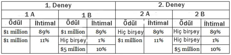 - Seçenek B: %10 olasılıkla 5.000.000 TL kazanacaksınız, %89 olasılıkla 1.000.000 TL kazanacaksınız ve %1 olasılıkla hiçbir şey kazanamayacaksınız.