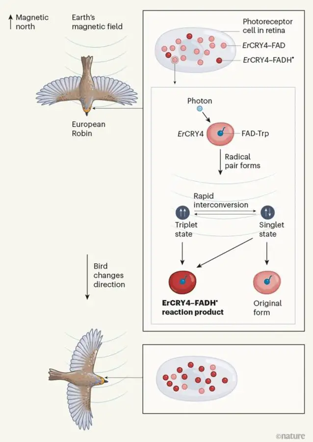Bu molekül kuşların retinasında bulunur ve ışığa duyarlıdır. Bilim insanları, kriptokromun ışıkla etkileşime girerek manyetik alan bilgilerini işleyebilen bir sistemin parçası olabileceğini düşünmektedir. Araştırmacılar, laboratuvar ortamında kriptokrom molekülünün manyetik alanlara tepki verdiğini doğrulamışlardır.