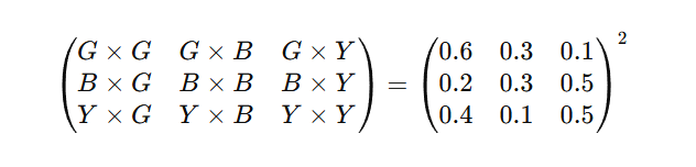 Çarpım sonucunda ortaya çıkan matrisin her bir girdisi, iki adımda bir durumdan başka bir duruma geçme olasılığını temsil eder. Örneğin G×Y, bugün hava güneşliyken iki gün sonra yağmurlu olma olasılığını verir. Matrisin karesi, tüm olası iki günlük senaryoları aynı anda kapsar.