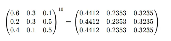 Bu matrisin her satırı, on gün sonraki bir günün güneşli, bulutlu ya da yağmurlu olma olasılığını temsil eder. Artık bugünkü havanın ne olduğu, yani hangi satırı seçtiğimiz, sonucu etkilemez. Onuncu gündeki olasılıklar her durumda aynıdır.