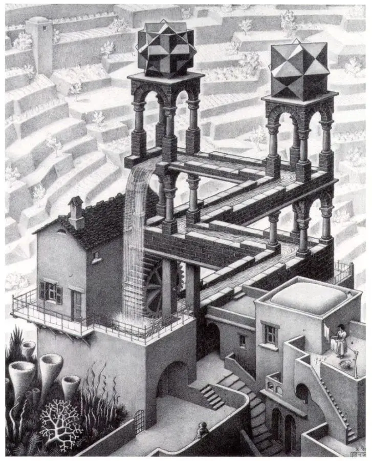 Bu fikir Escher’i doğrudan etkiledi ve harekete geçirdi. Ascending and Descending (1960) ile Waterfall (1961) adlı eserler bu esinle ortaya çıktı. Bu yapıtlarında Escher, figürleri ve suyu, sürekli olarak yükseliyor ya da alçalıyormuş gibi gösterdi. Ancak her hareket, sonunda başladığı noktaya geri dönerek imkânsız bir döngü oluşturuyordu.