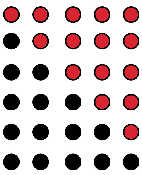 İlk birkaç doğal sayıyı toplayalım: 1, 2, 3, 4, 5. Kolay: Toplamları 15. Peki ya ilk 100 sayının toplamı? Görselde 1 + 2 + 3 + 4 + 5 toplamı, siyah ve kırmızı noktalarla iki kez gösteriliyor. Bu düzenlemede toplam noktaları saymak kolay: 5 × 6 = 30. Fakat her sayı iki kez sayıldığı için sonucu ikiye bölmek gerekiyor: 30 ÷ 2 = 15.
