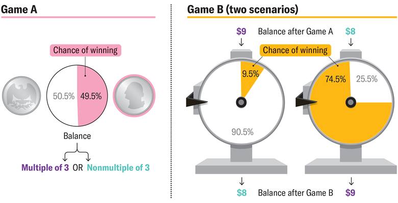 B oyunu da tıpkı A gibi 1 dolarlık bahisle oynanıyor. Ancak bu kez ortalama olarak her elde 87 sent kaybediyorsun. Örneğin 9 doların varsa, bu miktar üçe tam bölündüğü için kötü çarkı çeviriyorsun ve büyük olasılıkla kaybediyorsun. Elinde 8 dolar kalıyor. Sonraki elde 8 üçe bölünemediği için bu kez iyi çarkı çeviriyorsun ve kazanma olasılığın yükseliyor. Böylece paran tekrar 9 dolara dönüyor.