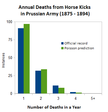 Poisson dağılımının tarihsel bir olayı incelemek için kullanıldığı 19. yüzyıla geri gidelim. O dönemde araştırmacılar, Prusya ordusundaki farklı süvari birliklerinde görev yapan subayların, 20 yıl boyunca atlar tarafından tekmelenerek ölme sayısını anlamaya çalışıyordu. Bu tür ölümler nadirdi. Ancak soru şuydu: Bu olaylar gerçekten rastlantısal mıydı, yoksa altında yatan başka etkenler mi vardı?