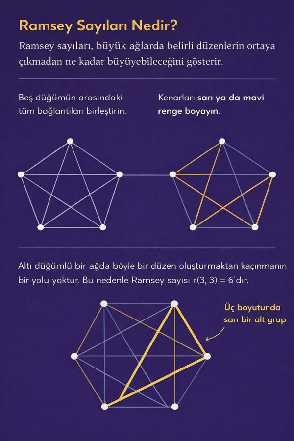 Ağların bu tür yapılara sahip olabilmesi için ne kadar büyük olmaları gerektiği sorusu, bizi Ramsey’nin adıyla anılan başka bir kavrama götürür: Ramsey sayıları.