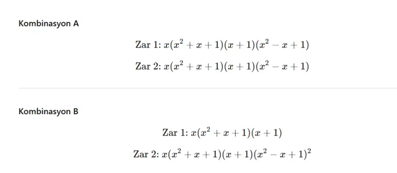 Buradan x=1 için x2+x+1=3 ve x+1=2 olur. Dolayısıyla her polinomun bir tane ve bir tane çarpanı içermesi gerekir. Bu koşulları sağladıktan sonra geriye yalnızca çarpanlarını nasıl paylaştıracağımız kalır. Bu da bize iki olasılık bırakır.