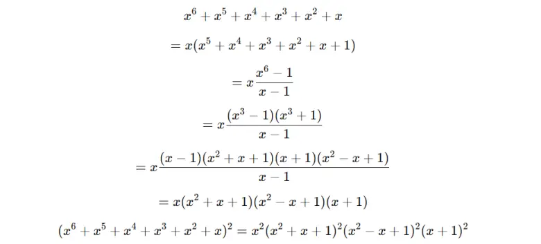 (x + x² + x³ + x⁴ + x⁵ + x⁶)²= x² + 2x³ + 3x⁴ + 4x⁵ + 5x⁶ + 6x⁷ + 5x⁸ + 4x⁹ + 3x¹⁰ + 2x¹¹ + x¹²