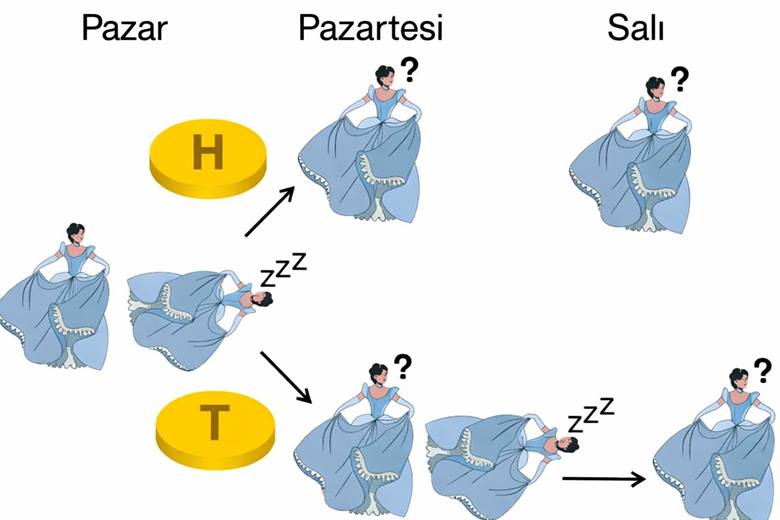 Para tura gelirse araştırmacılar Uyuyan Güzel’i pazartesi ve salı günleri uyandırır. Her uyanışta ona aynı soruyu sorar: Paranın yazı gelmiş olma olasılığı nedir?