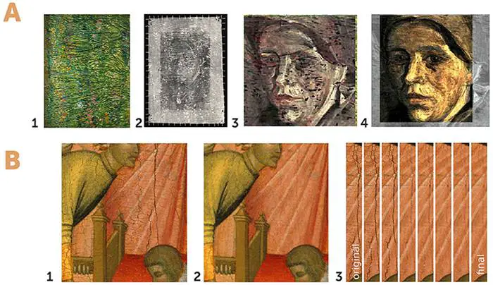 (A) Örneğin Van Gogh’un Patch of Grass (1) adlı tablosunun altında, farklı bir tablo yer alıyor. Bu tür gizli katmanlara “alt boyama” (2) denir. X-ray taramalarıyla bu gizli görüntüler ortaya çıkar. Ardından, dalgacıklar kullanılarak orijinal görüntü yeniden oluşturulur. (3–4). Bu yöntem, hem sanat tarihçilerine hem de restorasyon uzmanlarına önemli bilgiler sunar.